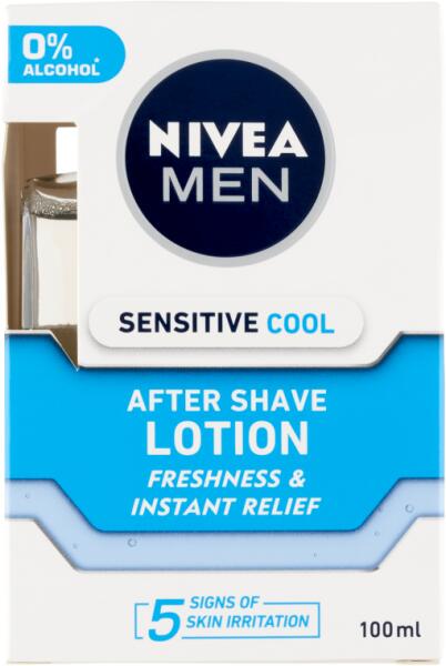 NIVEA® Sensitive Cool After Shave Lotion A kamillát tartalmazó alkoholmentes* hűsítő formula védelmet nyújt a borotválkozás során kialakuló bőrirritáció 5 tünete ellen: Égető…